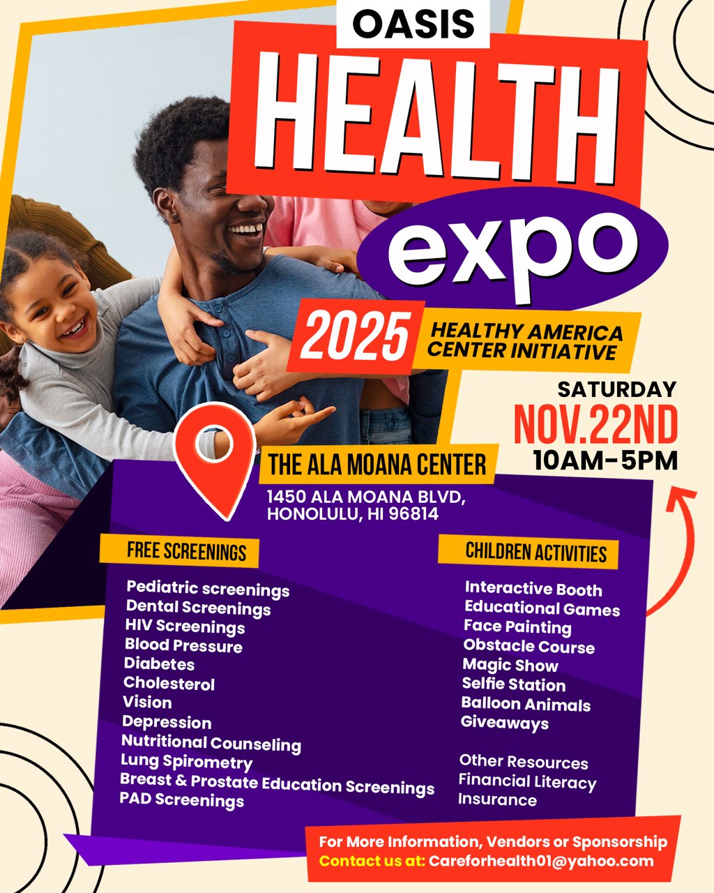 HONOLULU, HI, UNITED STATES, October 24, 2025 /EINPresswire.com/ -- The highly anticipated Oasis Health Expo 2025 is coming to the Ala Moana Center on Saturday, November 22nd, 2025, from 10:00 AM to 6:00 PM. This free, all-day event invites individuals and families to explore the latest in holistic wellness, natural health, fitness, and preventive care—all under one roof.Transforming the mall into an immersive wellness hub, the Oasis Health Expo will feature over 100 exhibitors, free health screenings, live fitness demonstrations, and a lineup of expert speakers addressing today’s most relevant health topics. From gut health to mental wellness, attendees will gain actionable insights and connect with trusted professionals in an energetic, family-friendly atmosphere.